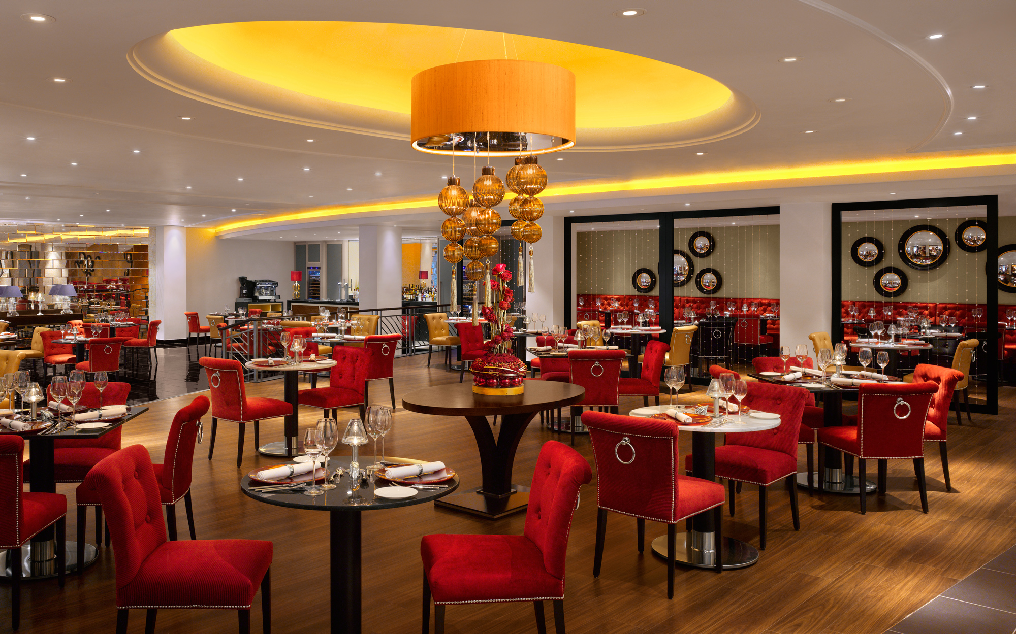 The restaurant was designed with the client request to highlight the 3 main colour of the brand- Gold Black and Red